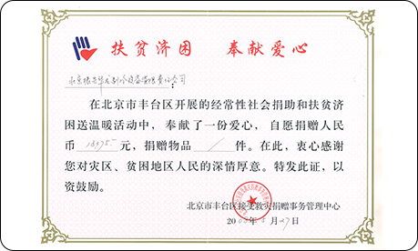 2008年5月,在汶川大地震事件中,公司及員工自愿捐助16375元,進行獻愛心共患難活動。